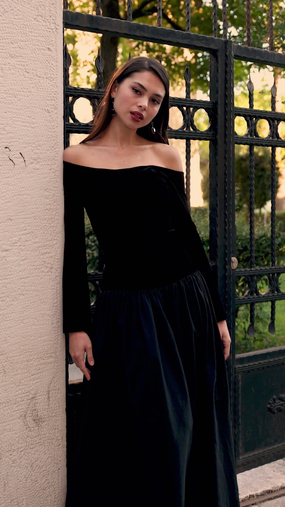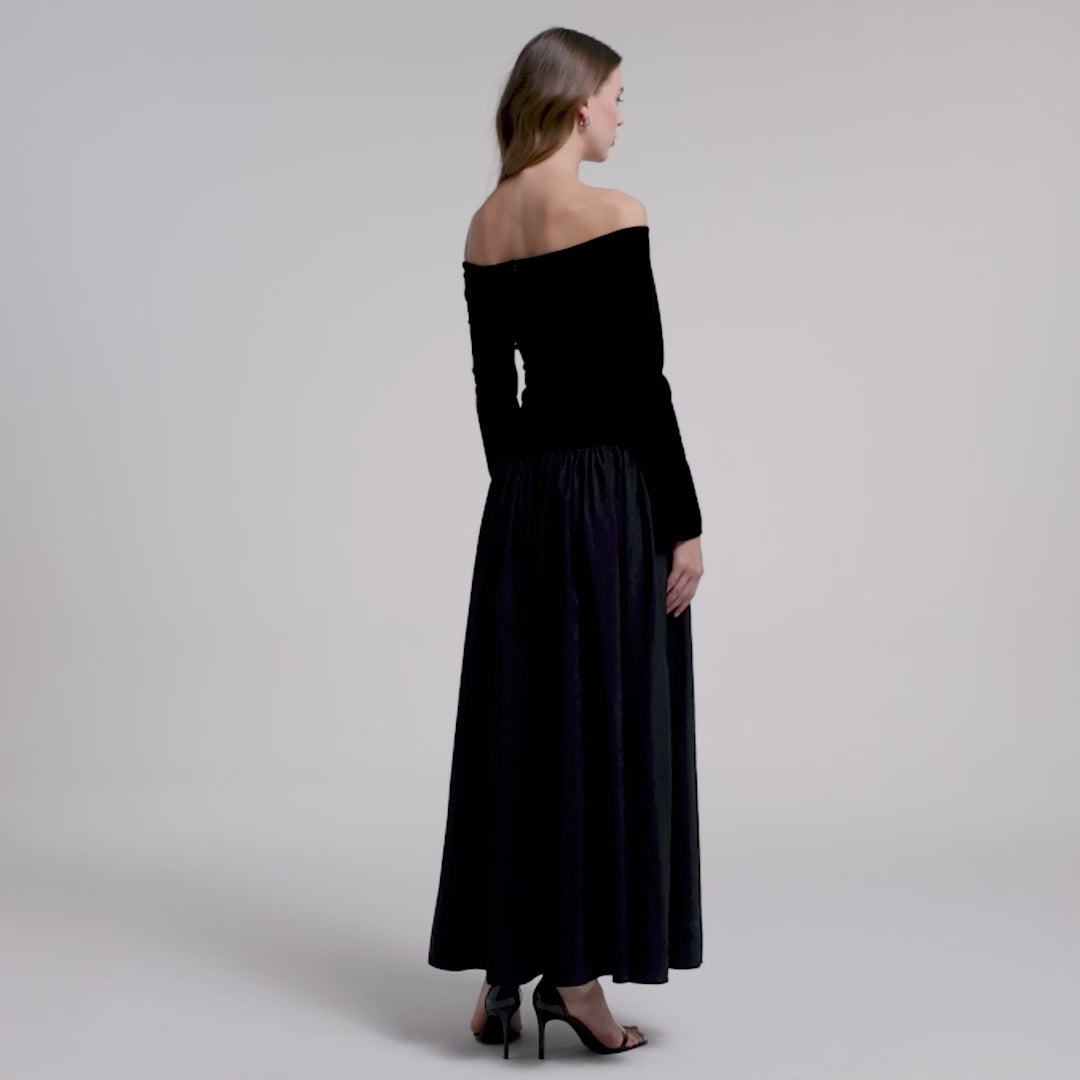 This off-shoulder maxi dress combines two contrasting textures, stretch velvet for the bodice and crisp taffeta for the skirt, to create a structured yet comfortable silhouette. The fitted top stays secure without restricting movement, while the A-line skirt adds volume without bulk. Long sleeves with wide cuffs give extra coverage with ease.