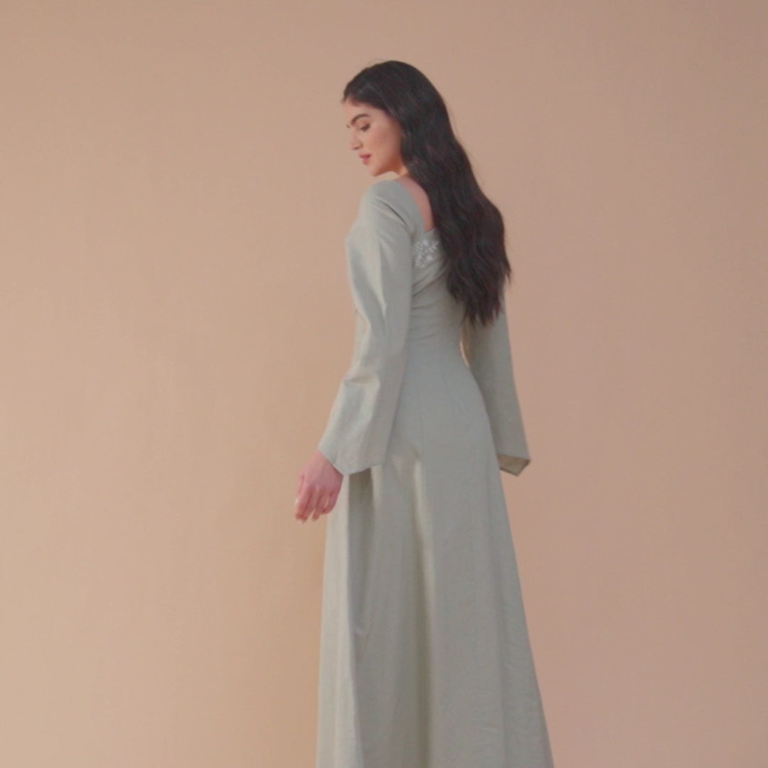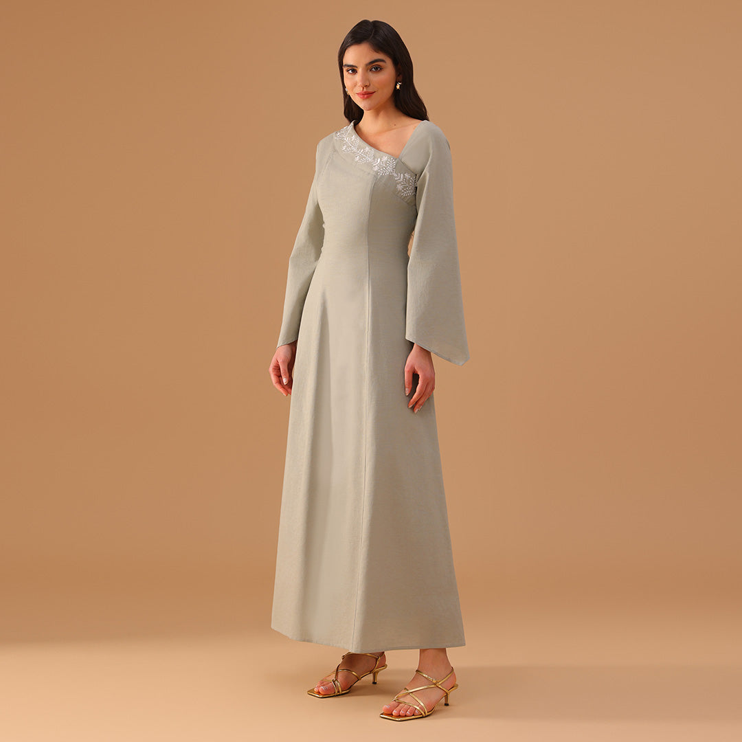 This embroidered dress is designed with a princess cut that flatters the figure while allowing movement. The bare shoulder neckline adds a refined touch, and the embroidery across the front and back gives it a unique detail that stands out at evening events, wedding receptions, or formal dinners. It’s a piece that feels effortless yet looks elevated.