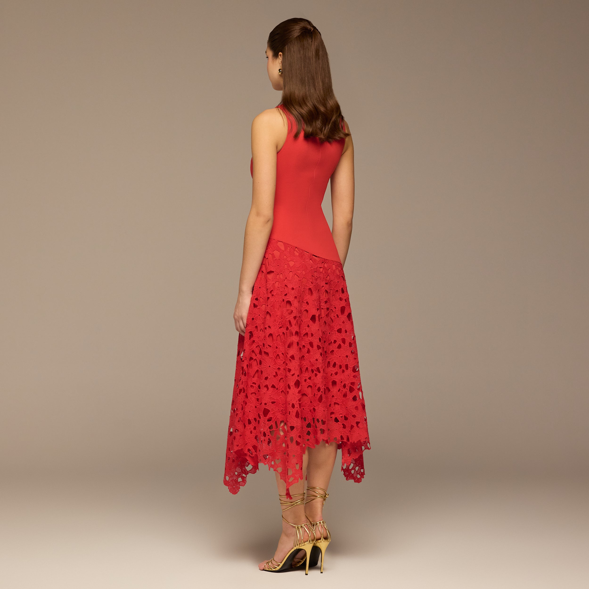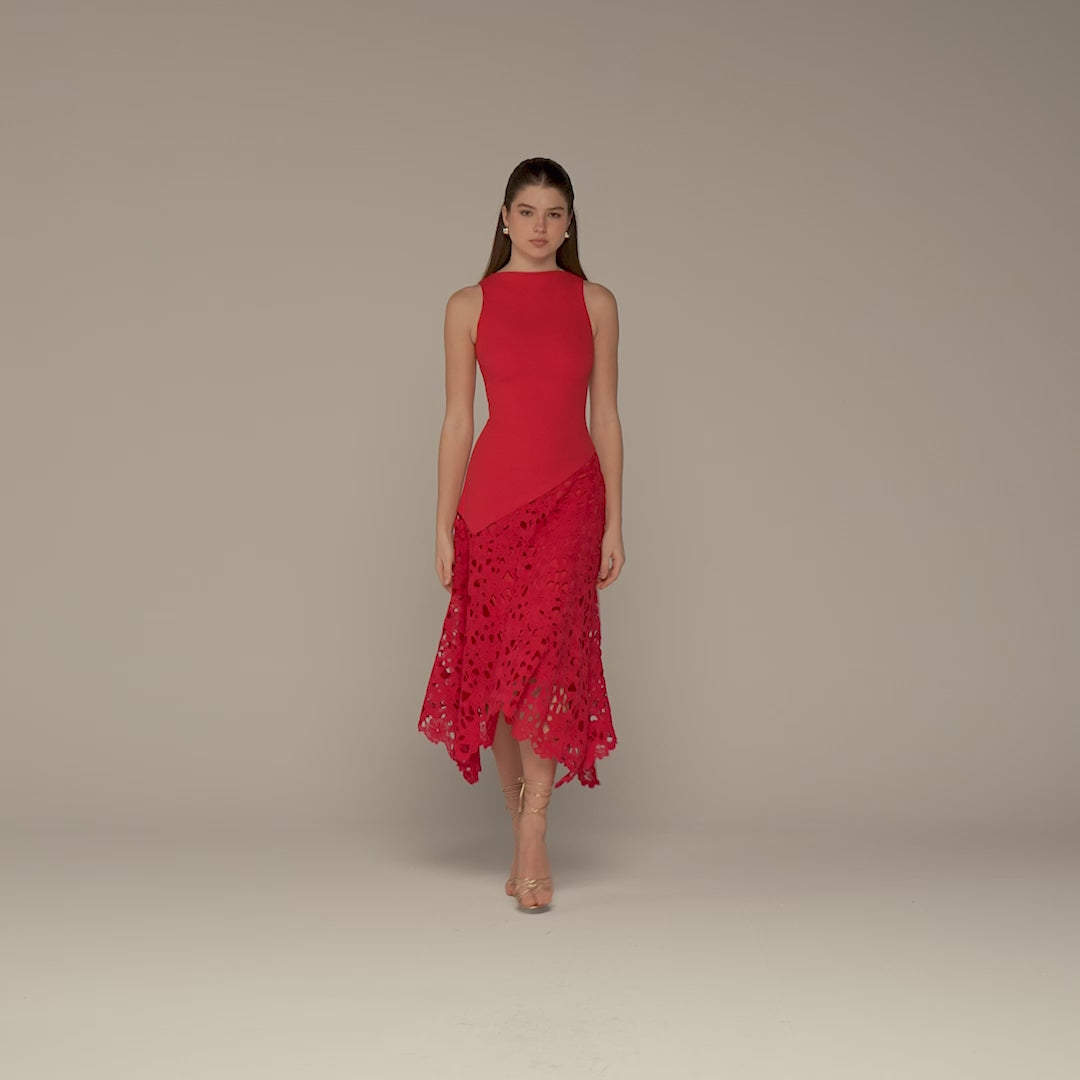This red cotton dress balances clean structure with a playful lace overlay for a look that feels bold yet wearable. The smooth bodice keeps the fit flattering, while the asymmetric lace panel adds texture and movement without overwhelming the design. A great choice for daytime events, summer dinners, or occasions where you want color with ease.