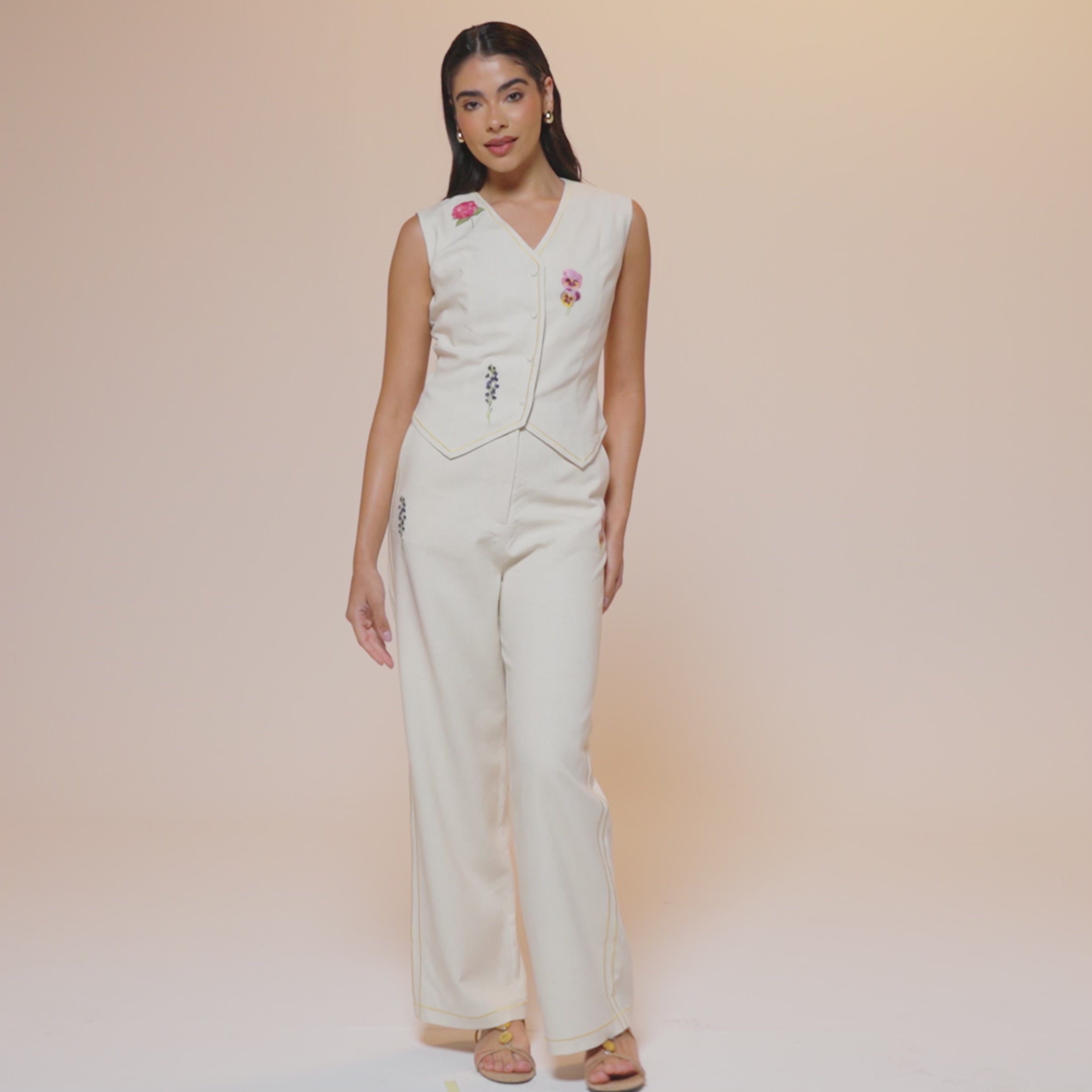 The Embroidered Linen Wide-Leg Pants from our Summer 2025 Collection. Cut from breathable linen with delicate floral and line embroidery, these wide-leg pants feature side pockets and a front zipper for a polished, effortless fit.