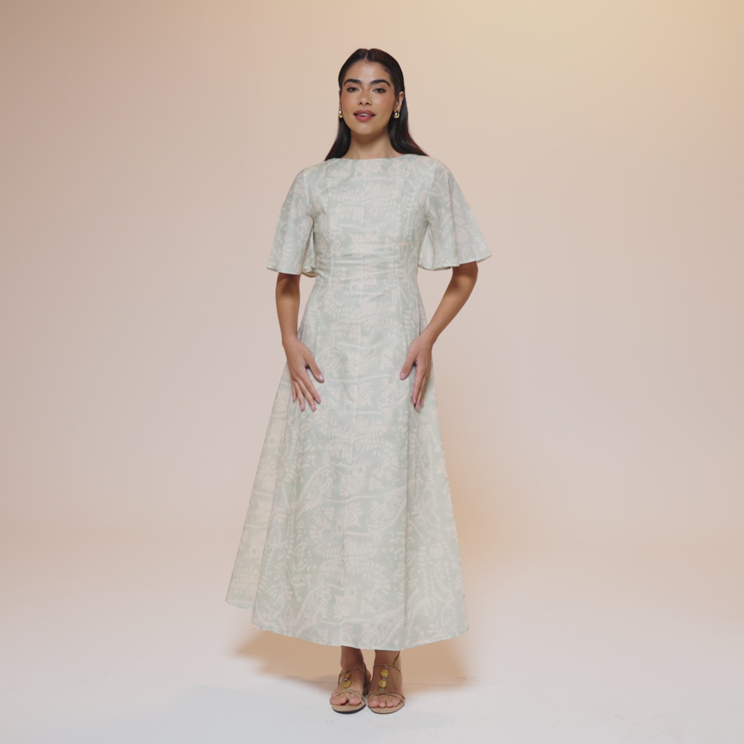 The Flared Maxi Dress with Butterfly Sleeves from our Summer 2025 Collection. Crafted from printed cotton, this dress features a rounded neckline, fitted waist, and paneled construction for a flattering A-line flare. The short butterfly sleeves add a romantic, airy touch.