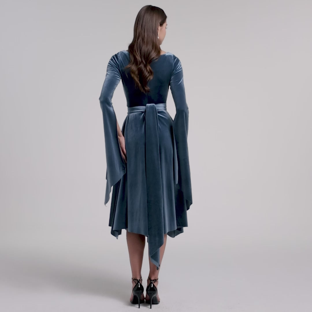 Blue-Grey Cape Sleeve Twist-Waist Velvet Dress