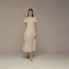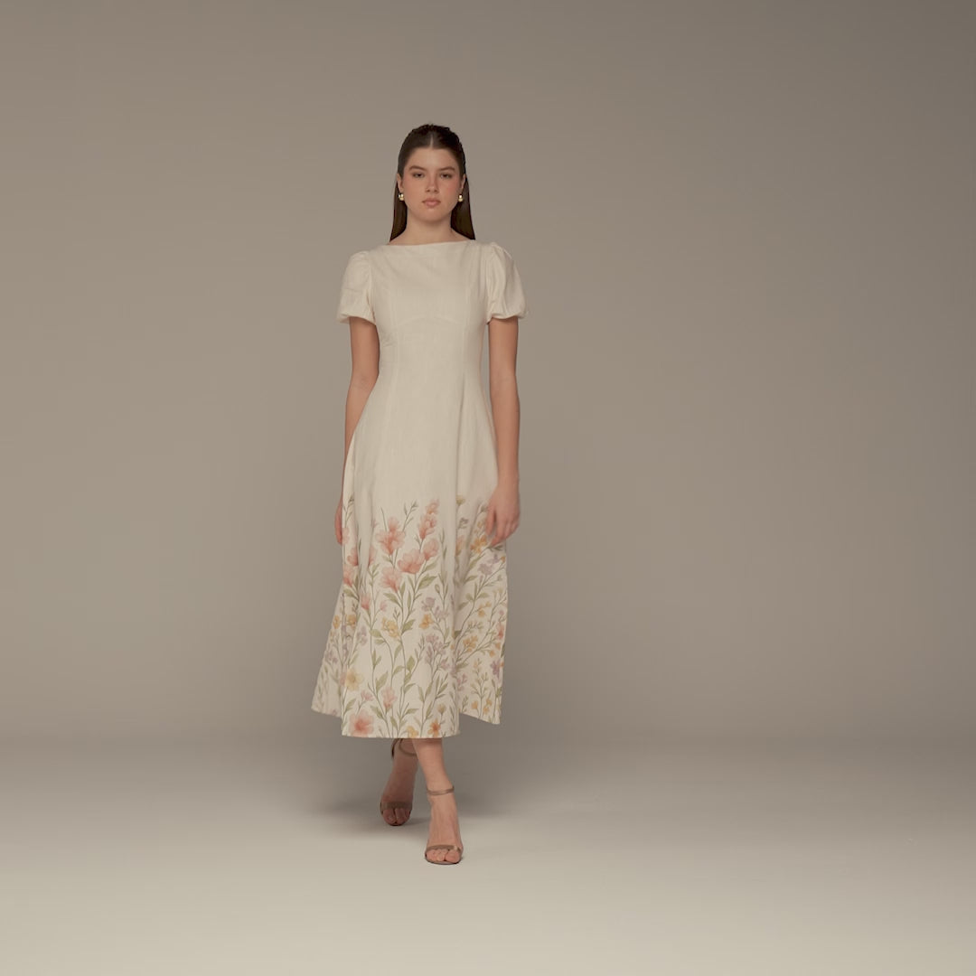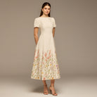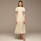 This cotton midi dress is designed for easy, everyday elegance. The clean upper silhouette keeps the look simple, while the floral print along the hem adds a soft, feminine touch without overwhelming the design. Comfortable and breathable, it’s a natural choice for daytime outings, casual gatherings, or relaxed weekends.
