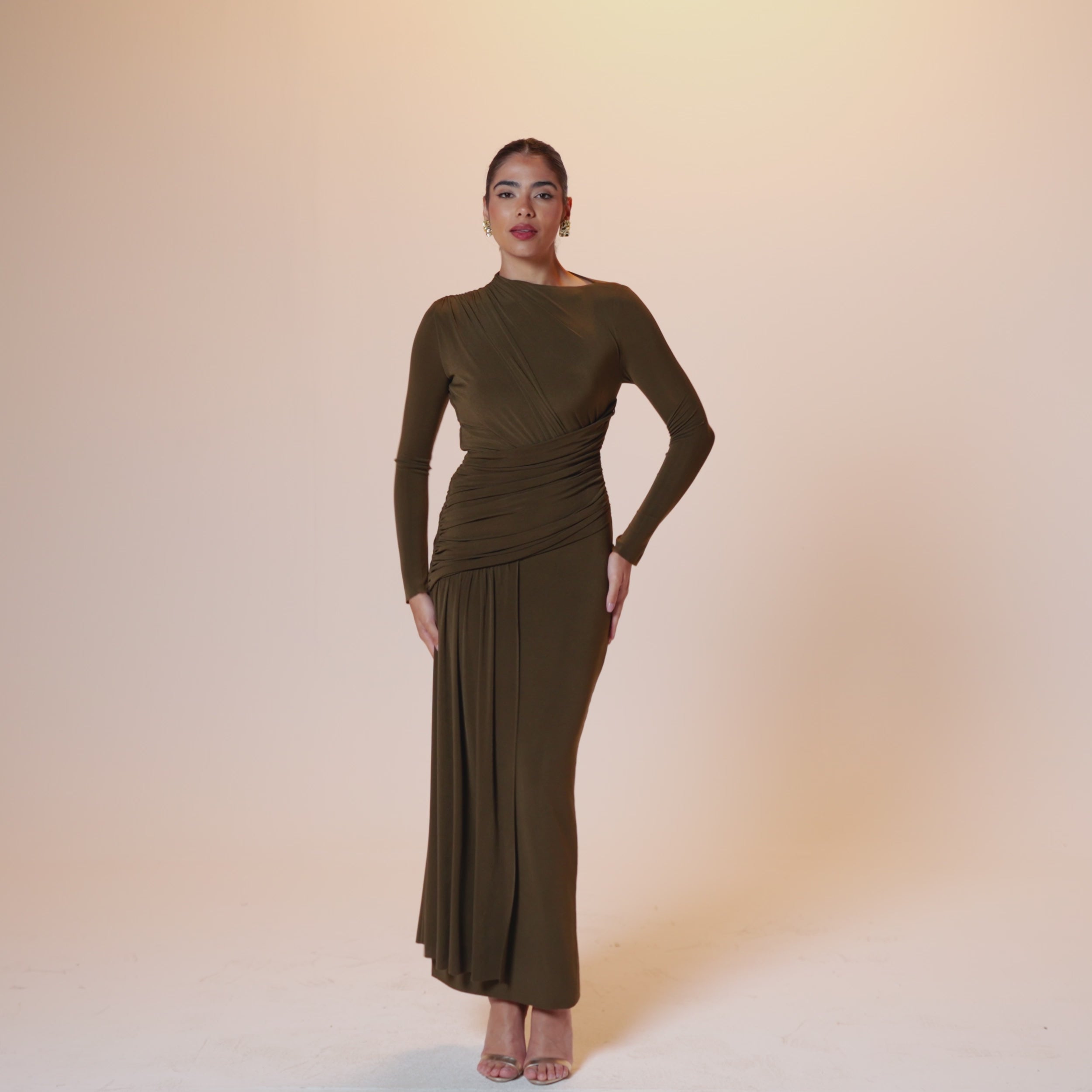 Designed for fluid movement with thoughtful shaping. This jersey maxi dress features gathered draping from the shoulders down to the bodice, creating soft structure that flatters without restricting. Slanted gathers along the waist in front and back subtly define the silhouette, while the straight cut keeps the overall look clean and elongating. Ideal for those seeking balance between comfort and quiet detail.