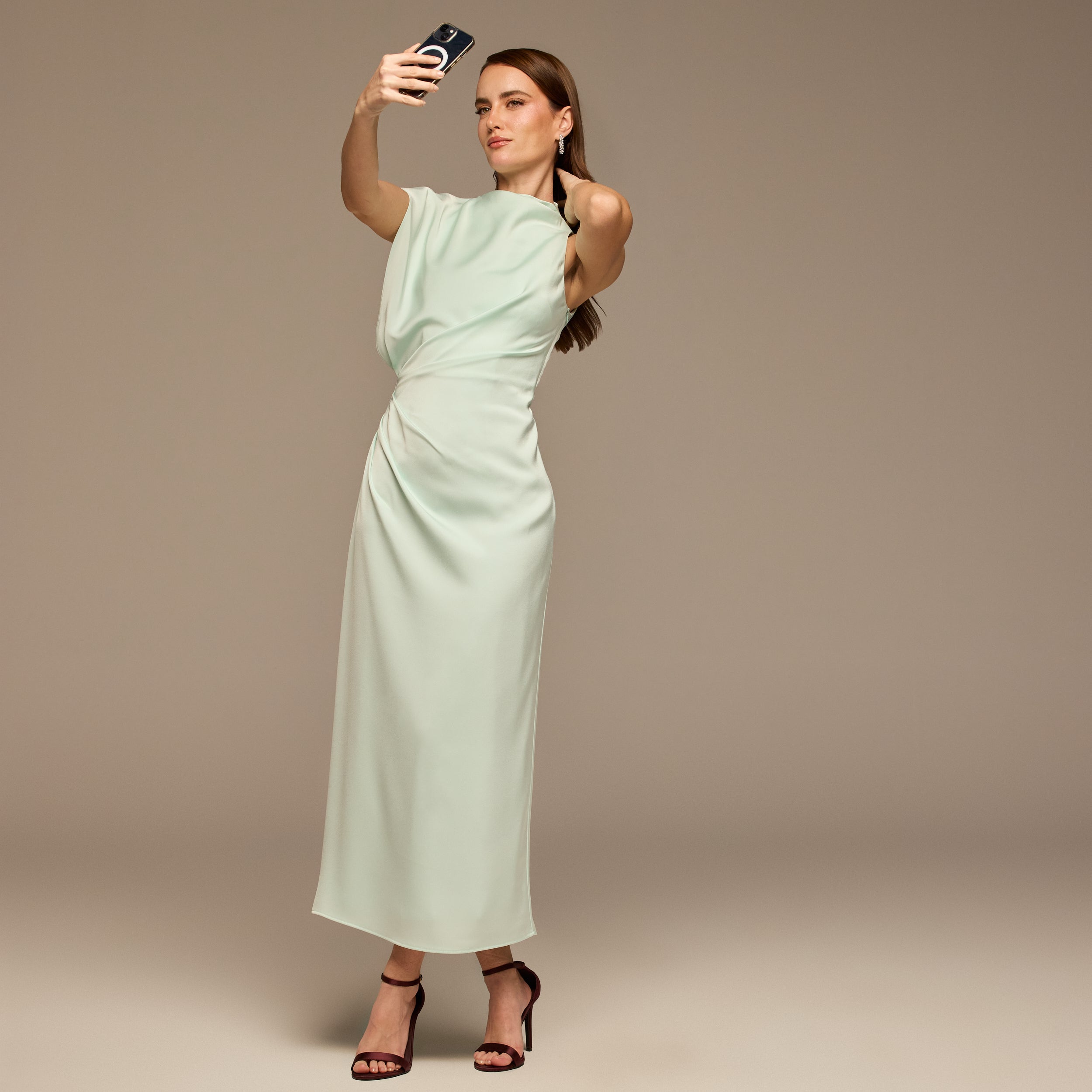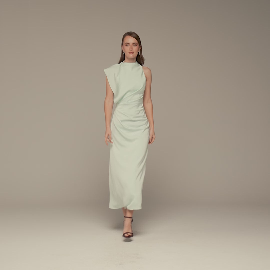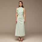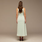 This maxi dress is crafted from smooth crepe satin that flows softly and feels comfortable on the body. The draped panel adds movement and gentle shape, creating a flattering look without clinging. A refined choice for weddings, evening events, or occasions where you want an elegant yet easy silhouette.