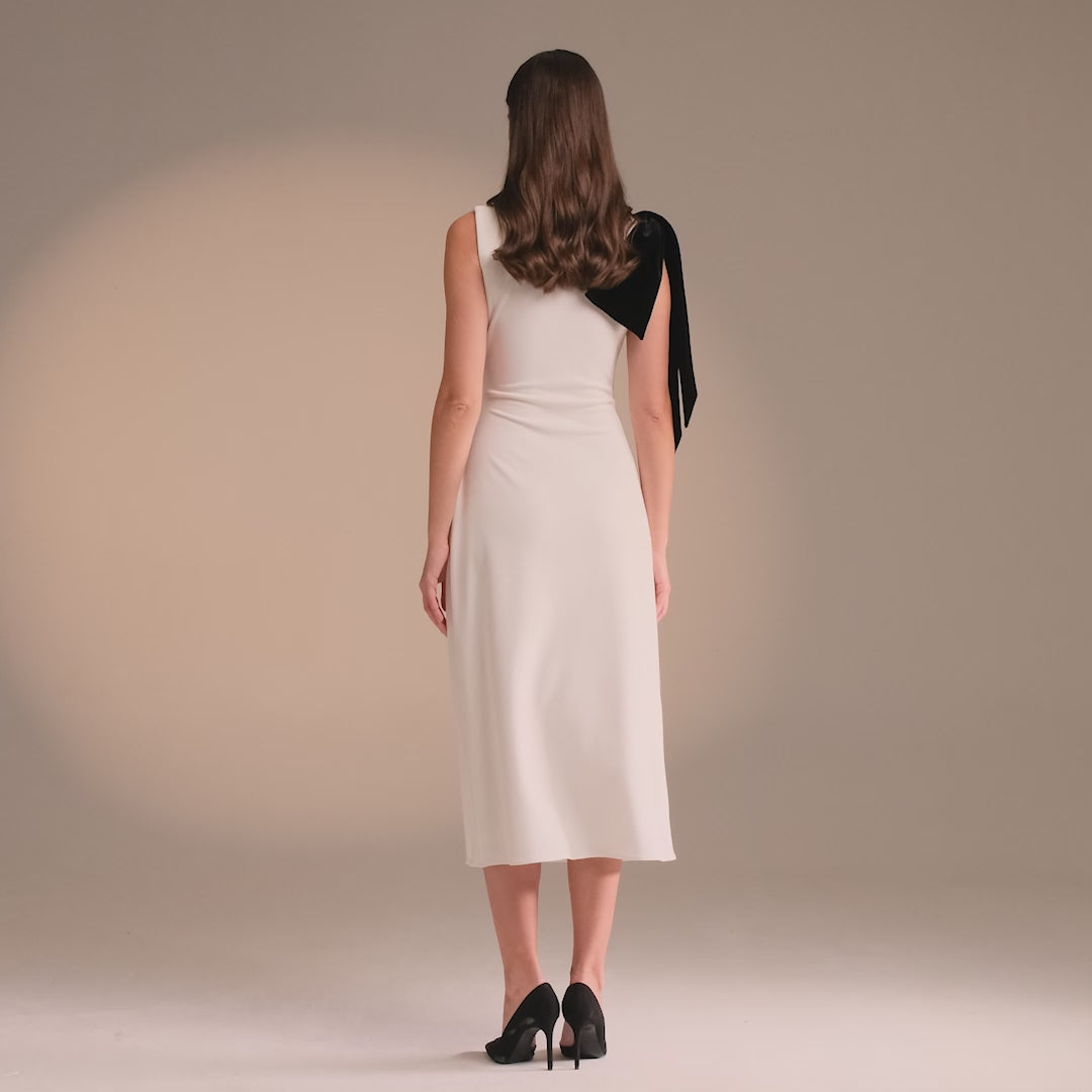 Indulge in elegance with our Midi Crepe Dress adorned with a chic shoulder bow. The classic design exudes sophistication and timeless style. Perfect for any special occasion, this dress will make you feel like a true fashion icon. Elevate your wardrobe with this luxurious piece.