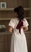 Designed in crisp, breathable linen, this midi dress balances polish with comfort. The clean front keeps the look refined, while the open back with a structured bow adds subtle personality without feeling too revealing. A flattering boat neckline highlights the collarbone, and the A-line silhouette allows easy movement while softly skimming the body.