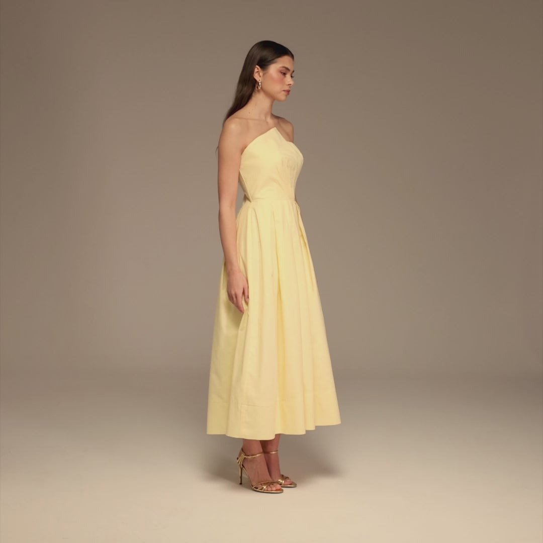 Designed for lightness and ease, this strapless midi dress is made from a breathable linen-cotton blend with soft pleats that give the skirt a gentle, structured flare. The bodice sits securely while allowing movement, making it ideal for warmer days or layered looks.