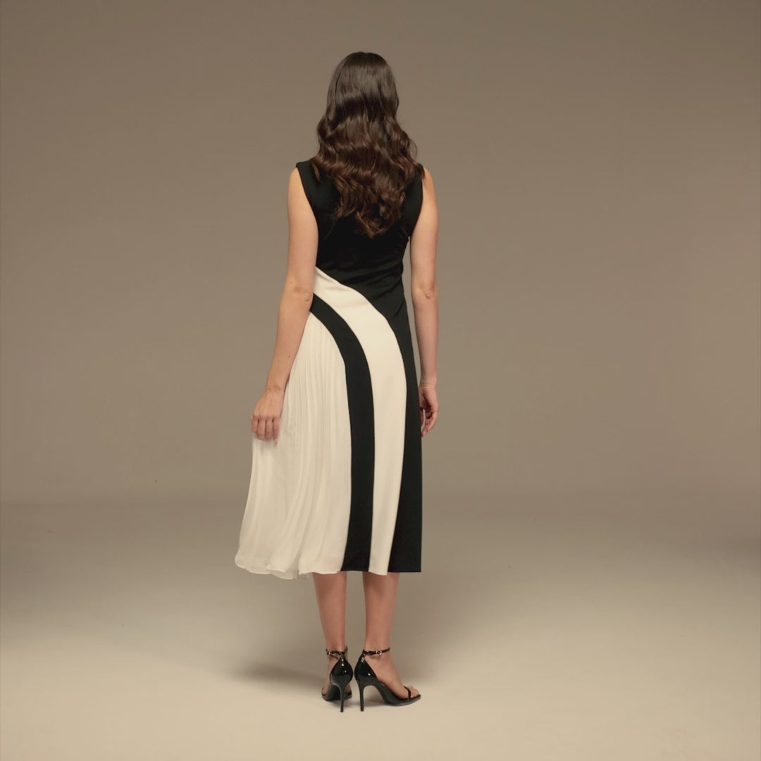 This Crepe and Chiffon Sleeveless Midi Dress stands out with its sleek silhouette and unexpected twist, featuring a classic black crepe base with a soft white pleated chiffon panel on one side. The fitted waist adds definition, while the midi length keeps the look effortlessly polished.